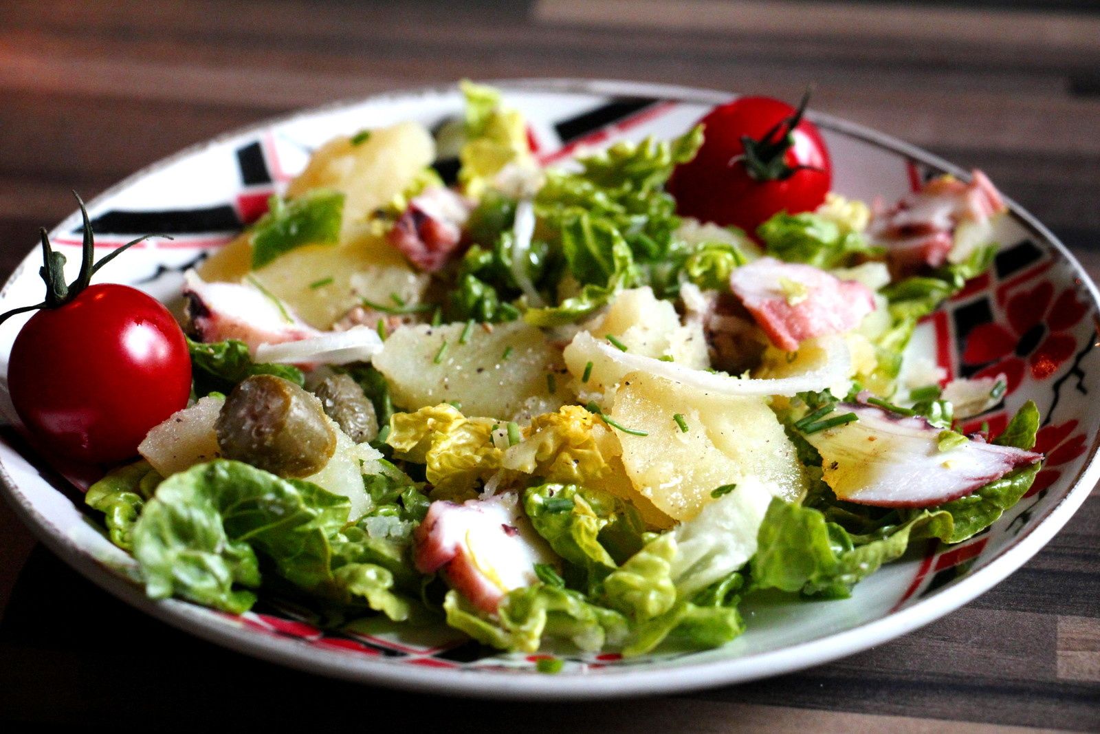 Mélangez tous les ingrédients dans les assiettes individuelles, ajoutez 2 tomates cerise.