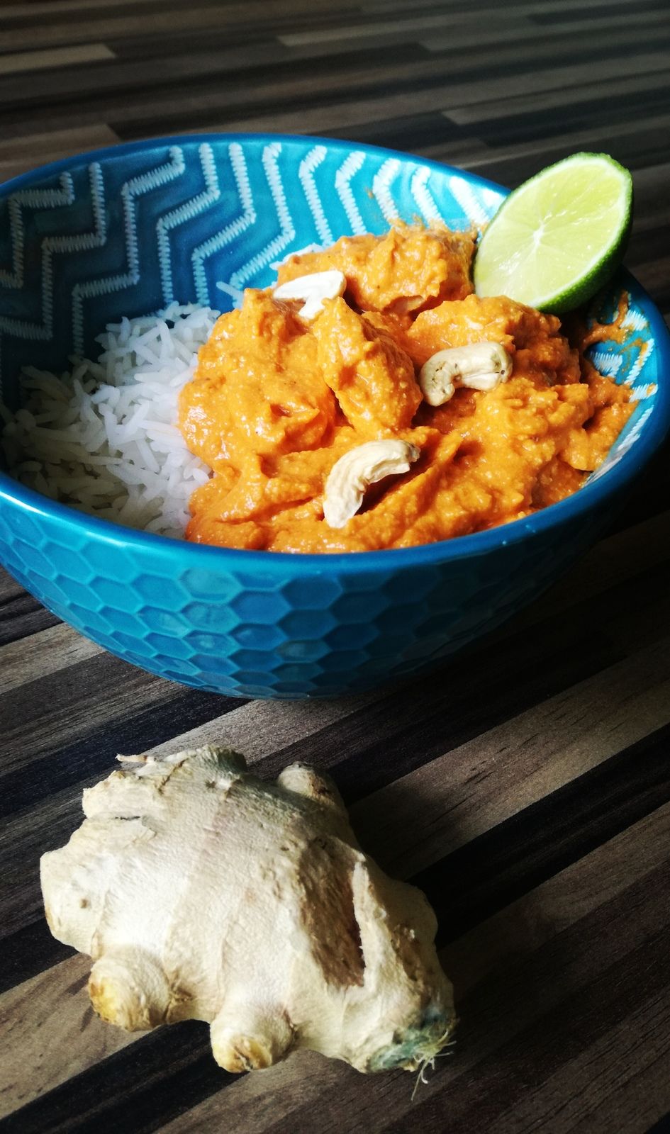 Laissez revenir 2 minutes pour que les épices imprègnent bien les oignons puis ajoutez les noix de cajou et le gingembre haché. Au bout de quelques minutes , ajoutez les tomates concassées et faites cuire 30 minutes . Passez ensuite au blender pour obtenir une sauce épaisse.